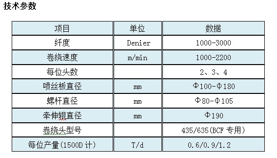 1、采用加長螺桿,交流變頻拖動工藝。 2、熔體停留時間短、無死角的節(jié)能型紡絲箱,裝有靜態(tài)混合器的熔體管道系統(tǒng)和混煉均化效果佳的 3、紡絲箱特殊設計,可紡單色絲和和三色絲。 4、上裝式杯形組件,大板面噴絲板和適紡細旦絲的微孔和長徑比。 5、緩冷器提高絲的質(zhì)量。 6、風速均勻穩(wěn)定的側(cè)吹驟冷裝置。 7、予過濾器裝置,提高及計量泵的組件及計量泵的壽命。 8、專用的BCF全自動換筒卷繞頭。